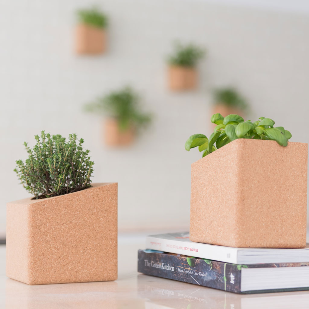 Um bloco com dois potes de cortiça, fita adesiva dupla face, bolas de argila, duas embalagens com substrato, dois pacotes de sementes biológicas e instruções para cultivo. Tamanho 22 x 10 x 10 cm