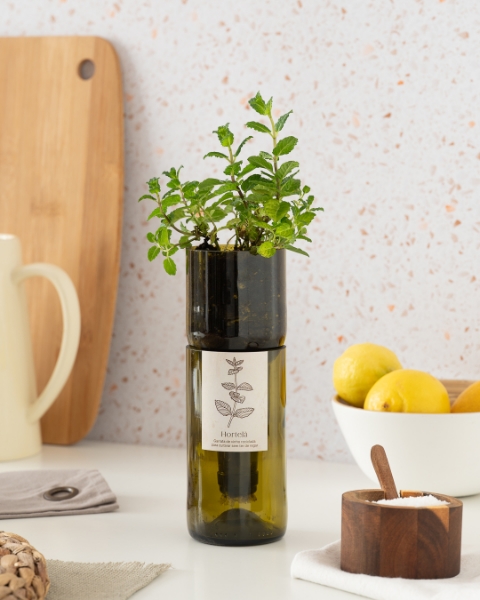 Bottiglia di vino riciclata con sistema di auto-irrigazione
